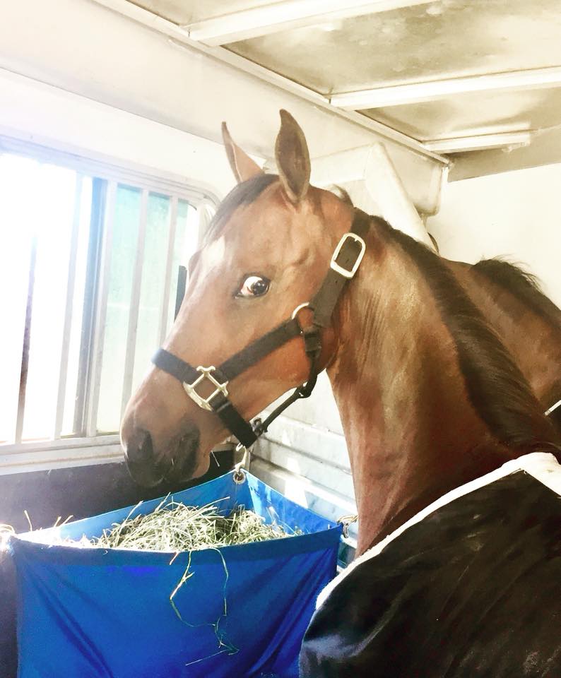 Horses looking out of the trailer -